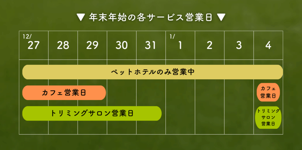 TOP / お知らせ / 年末年始休業のお知らせ Newsニュース 2025.12.18 お知らせ 年末年始休業のお知らせ いつも当施設をご利用いただきありがとうございます。 誠に勝手ながら、下記期間はペットホテルのみの営業とさせていただきます。 12月27日(土)〜1月4日(日) また、カフェの年末年始休業の期間は以下の通りです。 12月30日(火)〜1月3日(土) トリミングサロンの年始休業期間は以下の通りです。 1月1日(木)〜1月3日(土) ご理解の程、よろしくお願いいたします。 NEWS一覧へ戻る